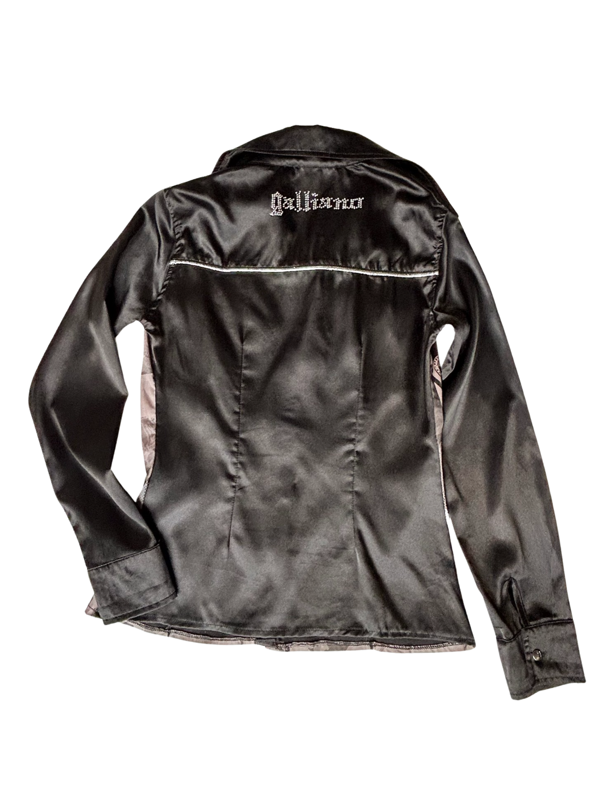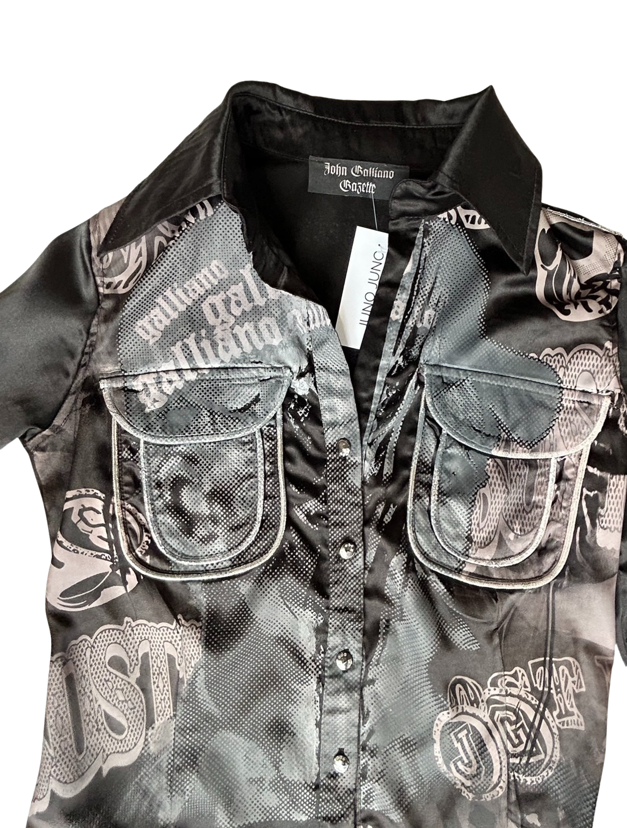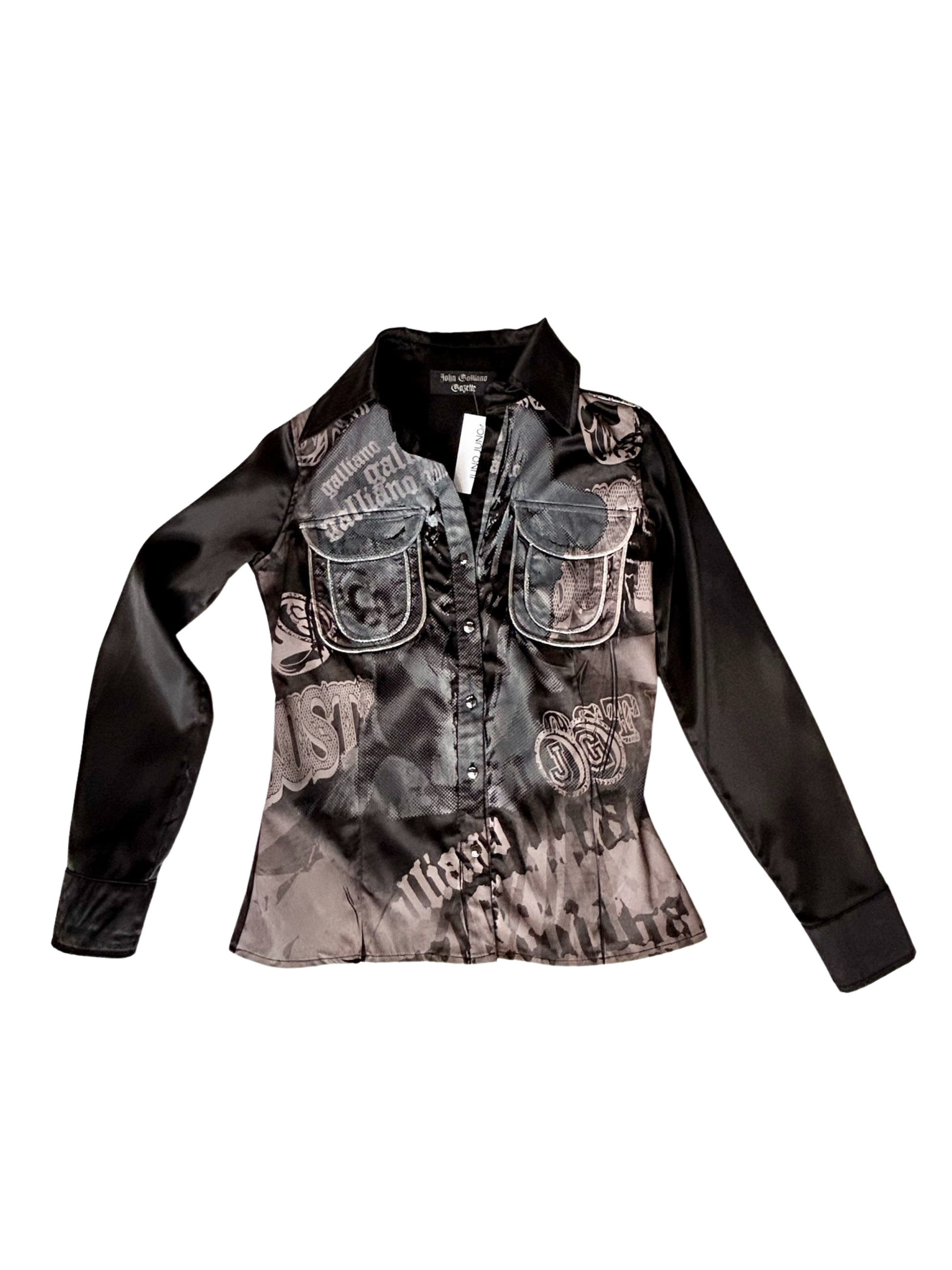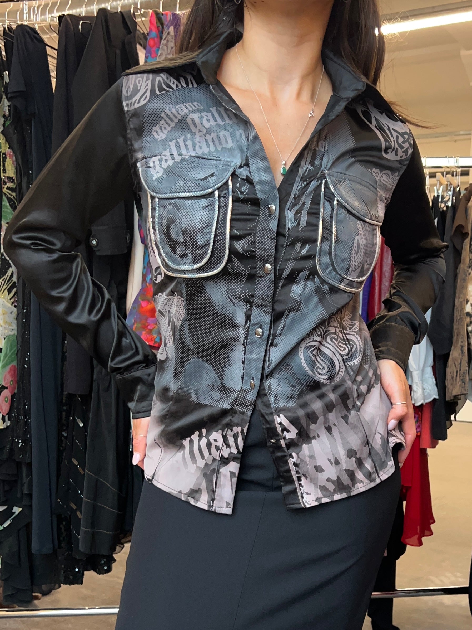 A silky black shirt with snap buttons in front and a fitted design. The print shows a moody Y2K print in gray and dusty pink with some silver details. Iconic Galliano embellished on the back.