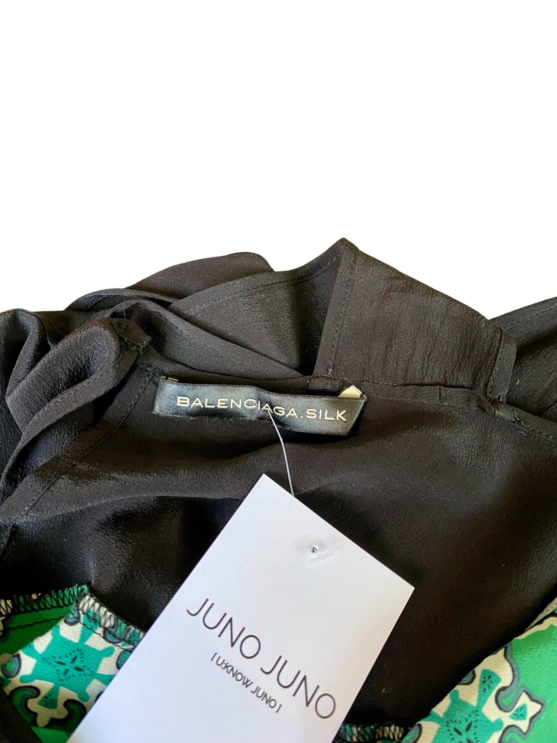 Lovely Balenciaga silk top with a jade green mosaic pattern. V-neckline and crossing straps in the back. So light and lush!
