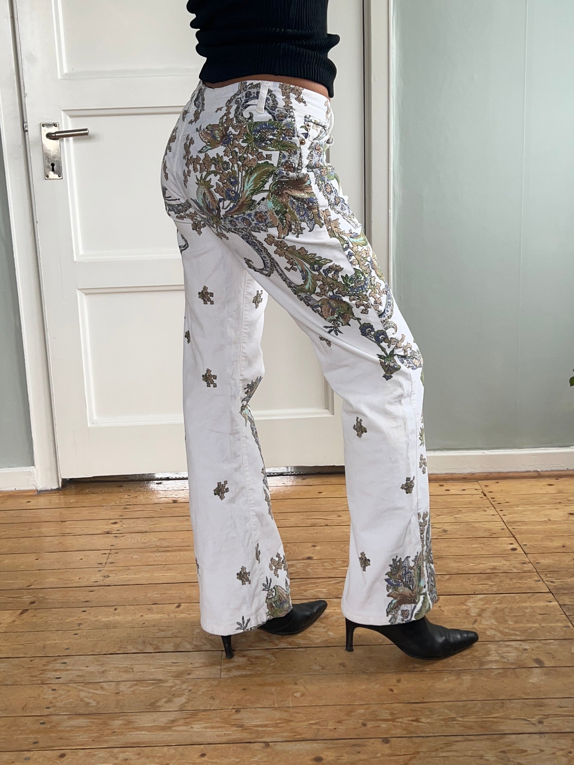 These Cavalli corduroy pants are a baroque fantasy. The intricate floral print in earthy greens and browns sits on a soft ivory base, creating a romantic yet bold statement. With a flared leg and low Rise cut, they capture Cavalli’s maximalist vision from the mid 2000s.