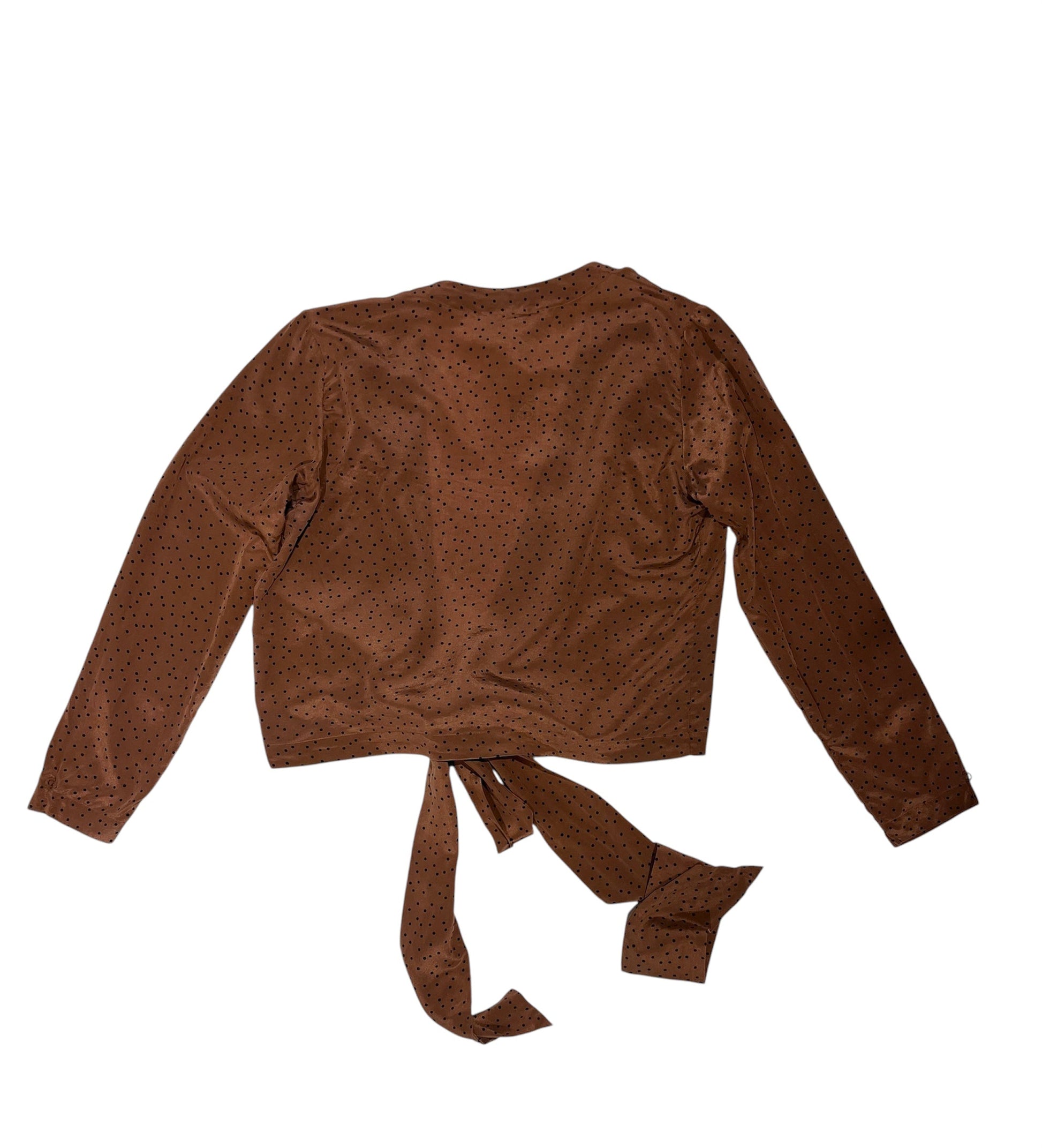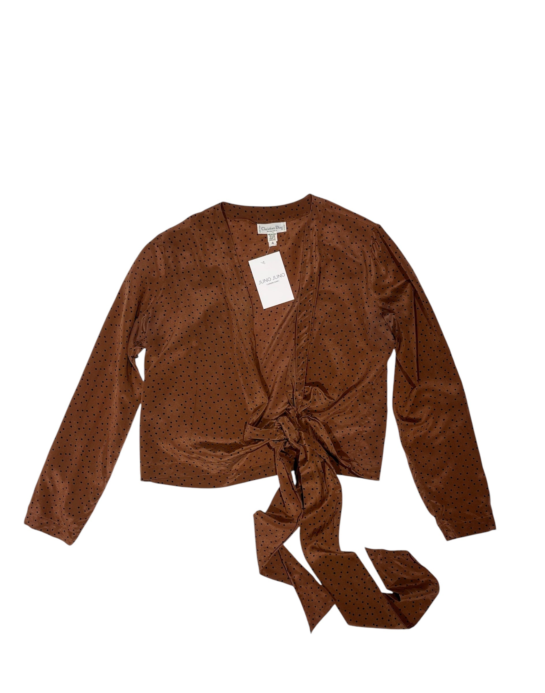 The cutest blouse from Christian Dior! The blouse has a marron color with black dots. It has a shorter length, with a plunge neck and straps to tie in the front.