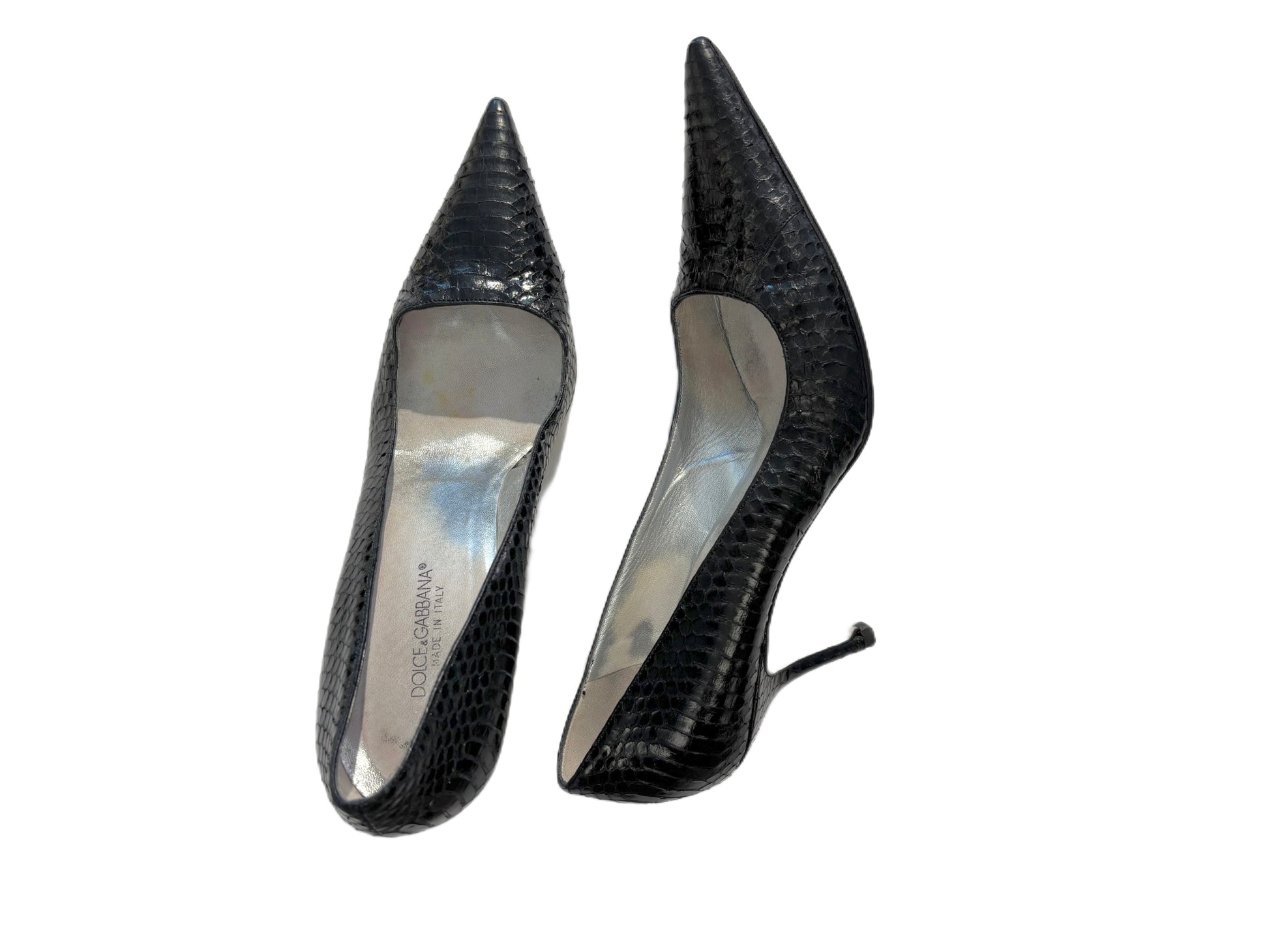 These Dolce & Gabbana pumps channel pure sophistication with their sleek, pointed-toe silhouette. Crafted in a textured snakeskin-effect leather, they balance edge and elegance in equal measure. A versatile pair that transitions seamlessly from business to cocktail hour.