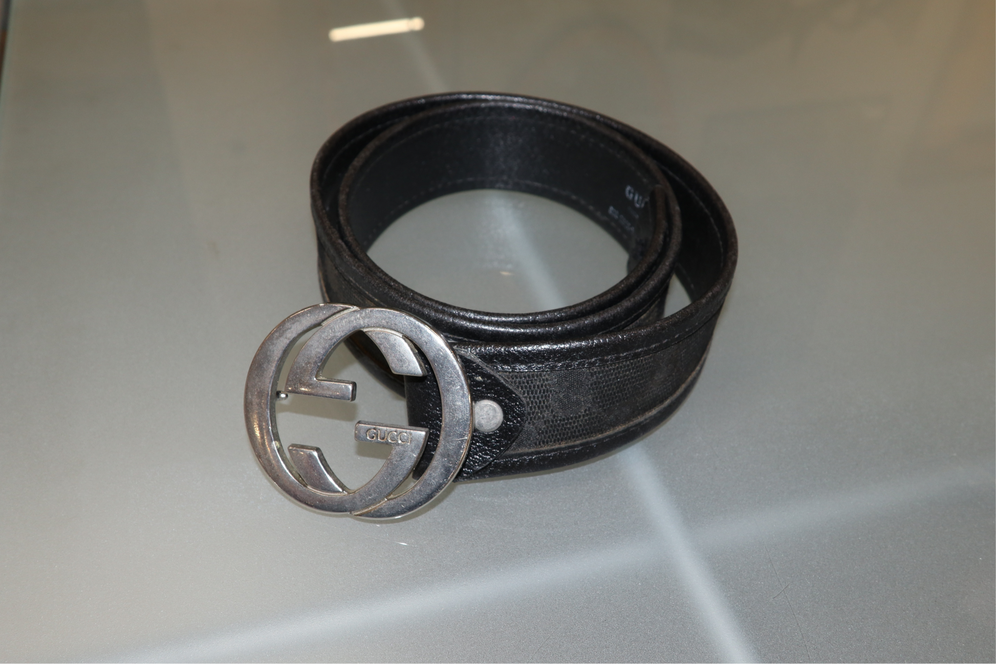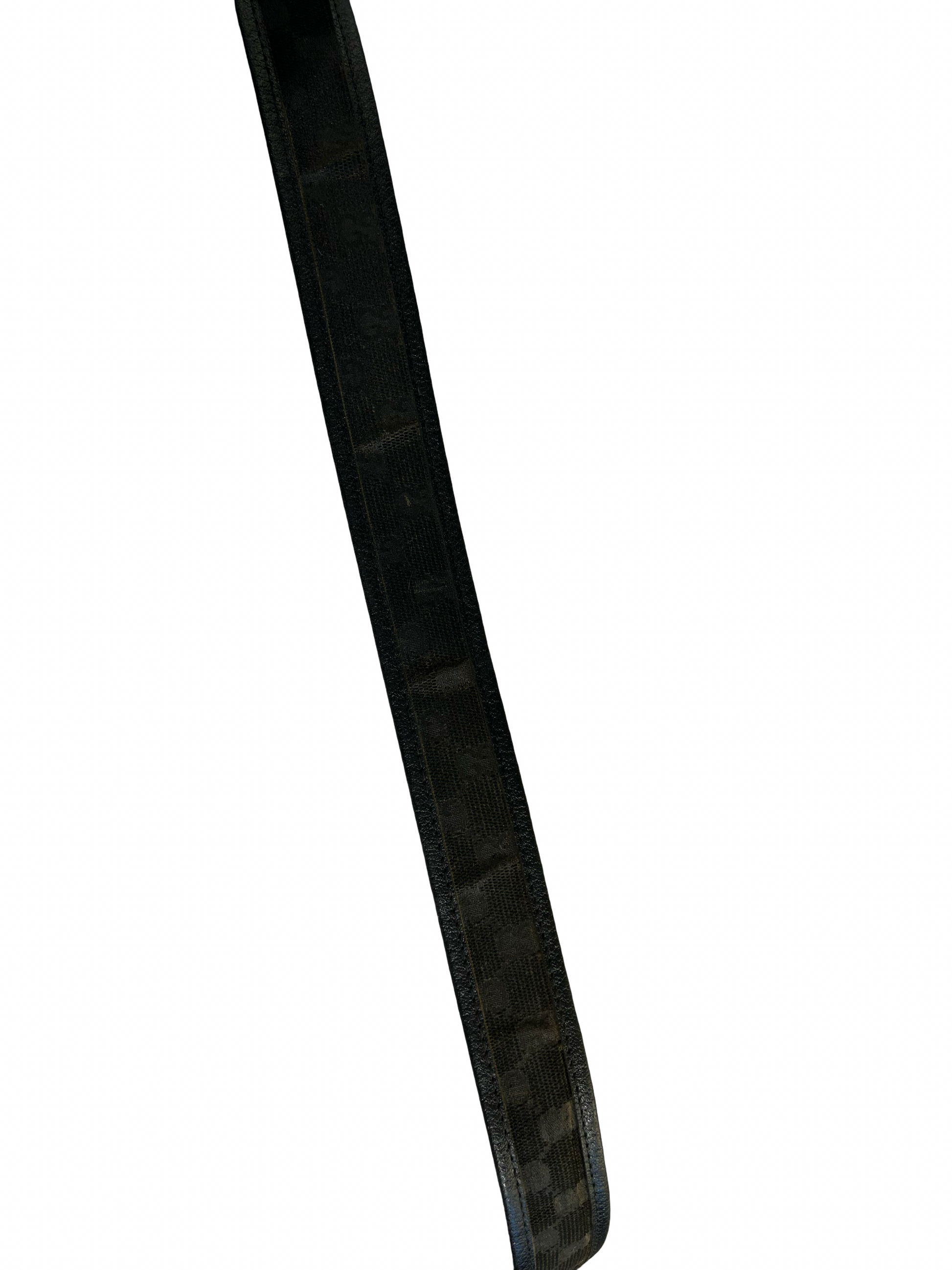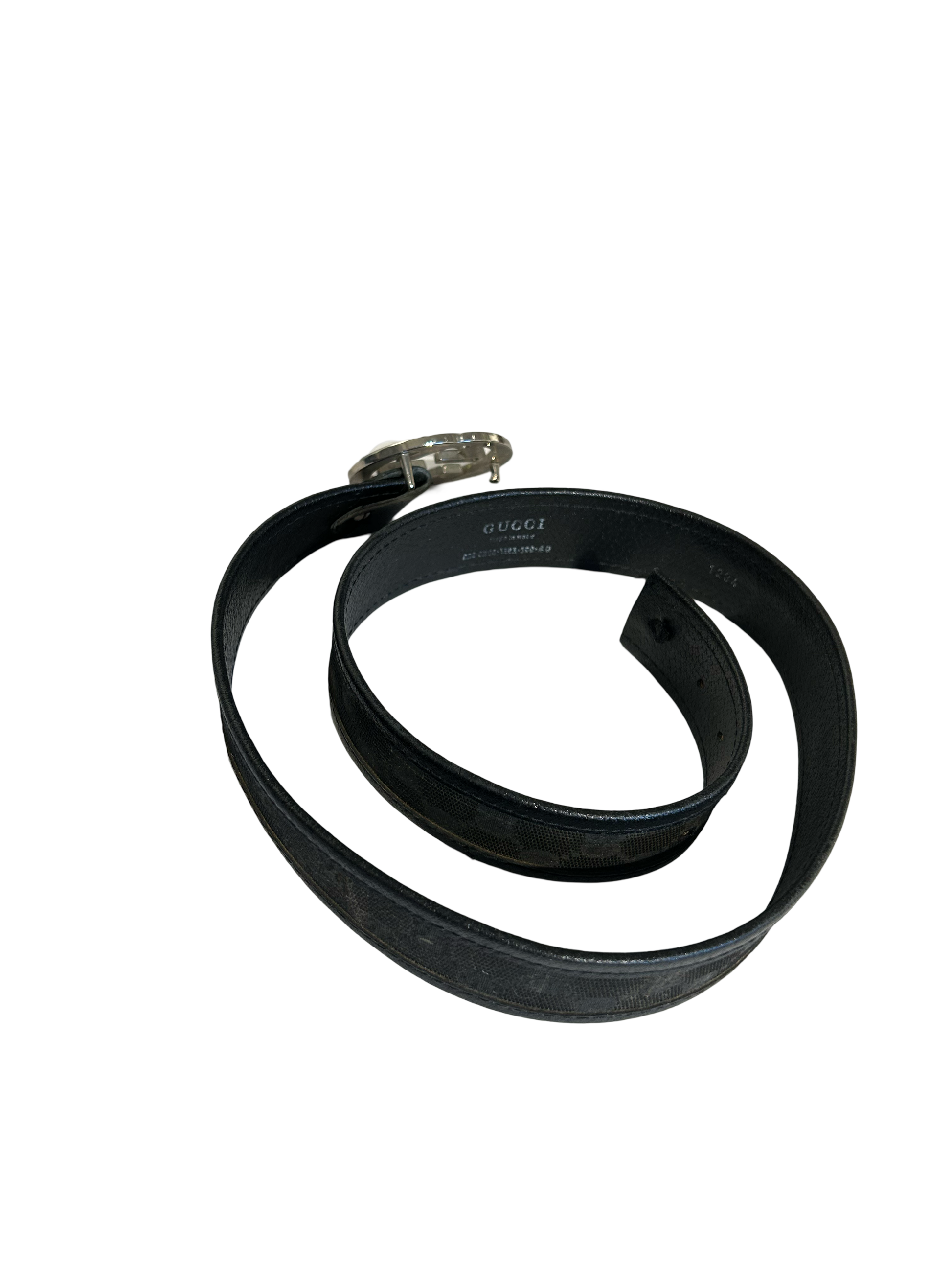 Classic and iconic belt by Gucci with monogram fabric and a silver colored buckle. Cut on the end by previous owner.