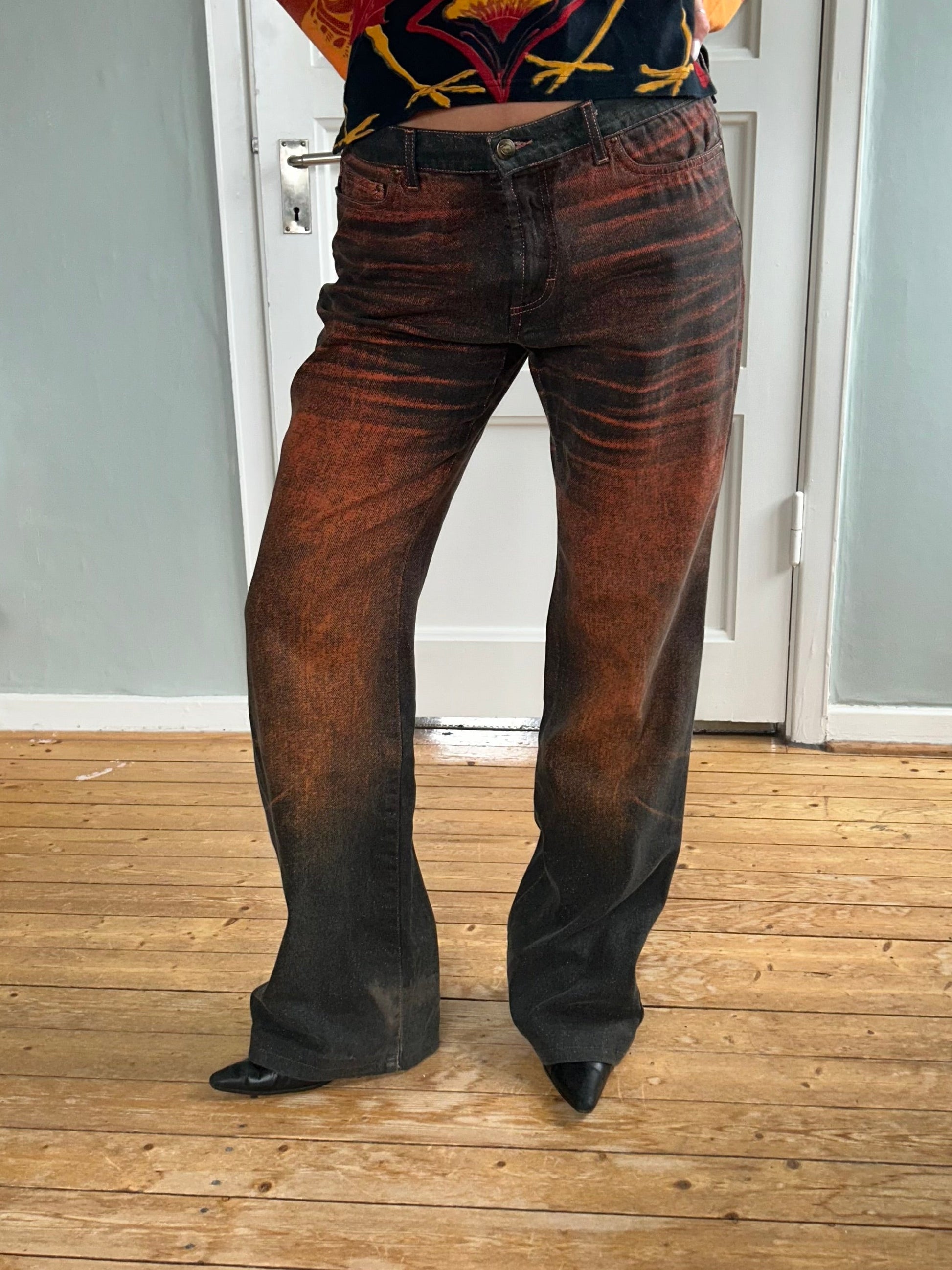 These early 2000s Just Cavalli jeans are a bold reinterpretation of classic denim. Featuring a dramatic gradient wash in burnt orange fading into brown and grey, they strike a perfect balance between art and attitude.