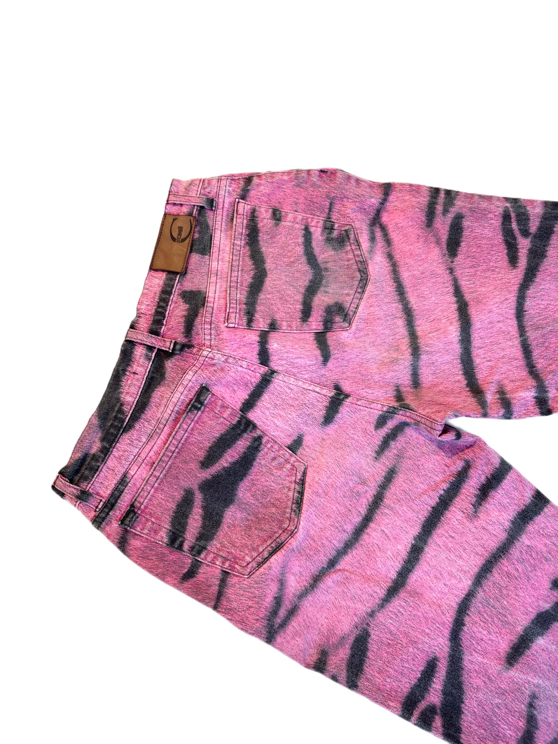 These Y2K Just Cavalli jeans are pure attitude. Cut in a straight-leg silhouette, the bold pink and black zebra print is unmistakably Cavalli—wild, fearless, and unapologetically maximalist.