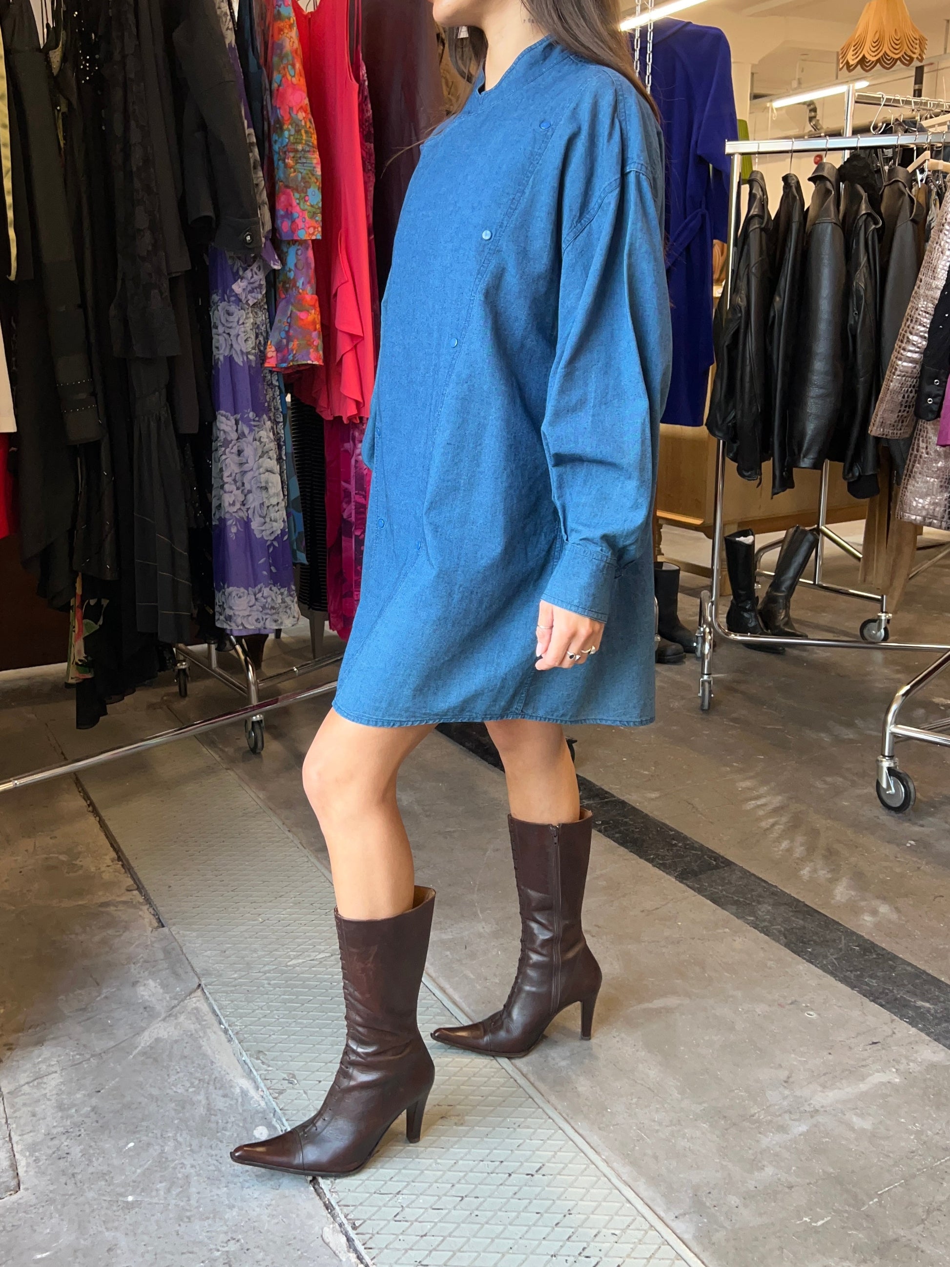 A denim shirt from Kenzo Jeans. The shirt also doubles as a dress. It has ballon sleeves with a fitted cuff, and a high neck collar. The shirt also has a small embroidered flower on the right side of the bust, next to the buttons. Closes on the right side with buttons.