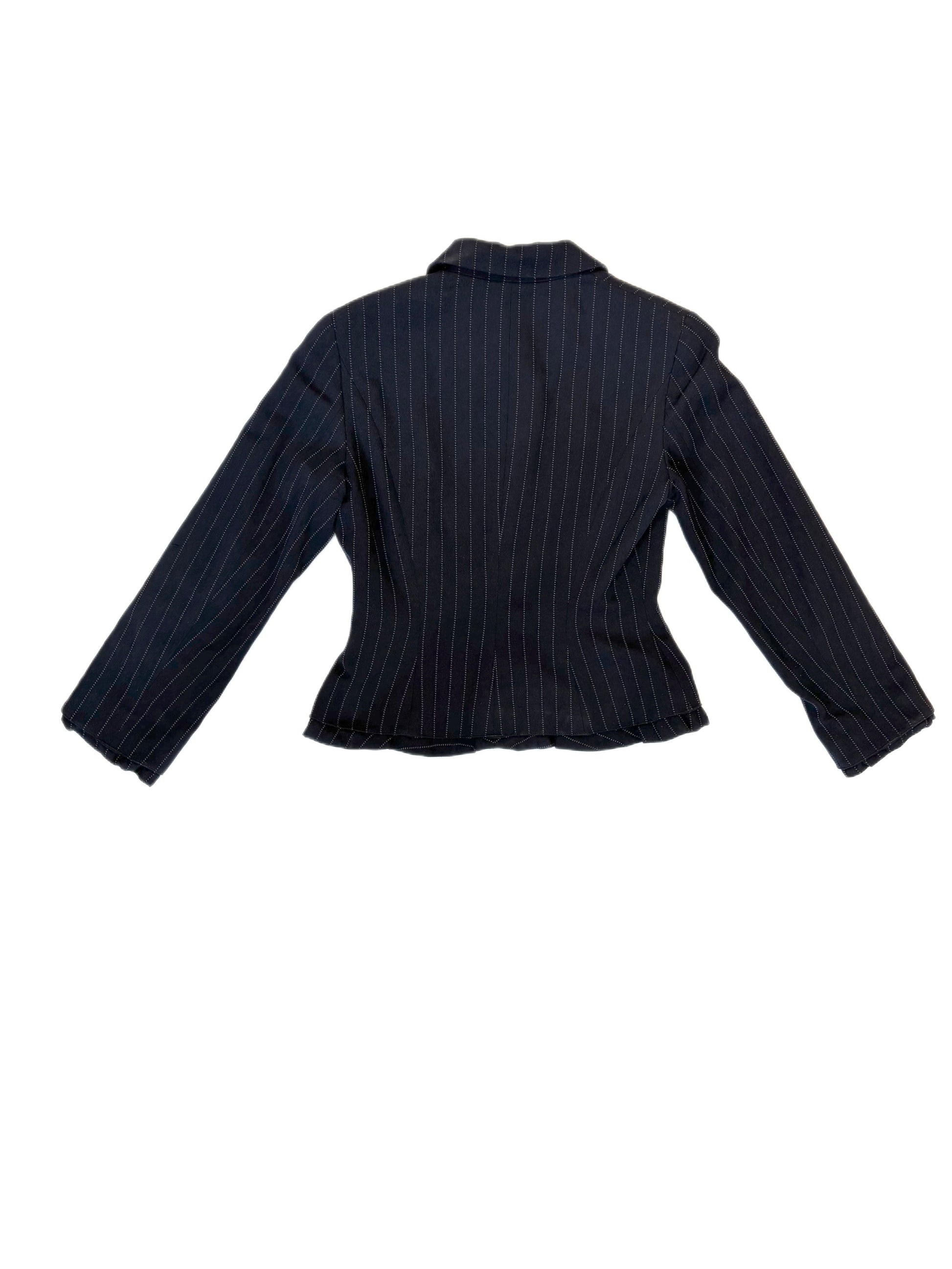 A true early 2000s gem, this Kenzo Paris blazer blends structure with subtle femininity. Tailored in a slightly cropped fit with a ruffled hem and classic pinstripe pattern, it reflects Kenzo’s take on Parisian chic. The scalloped lapel and covered buttons add a soft elegance to an otherwise classic businesswear piece, perfect for balancing masculine cuts with a delicate edge.