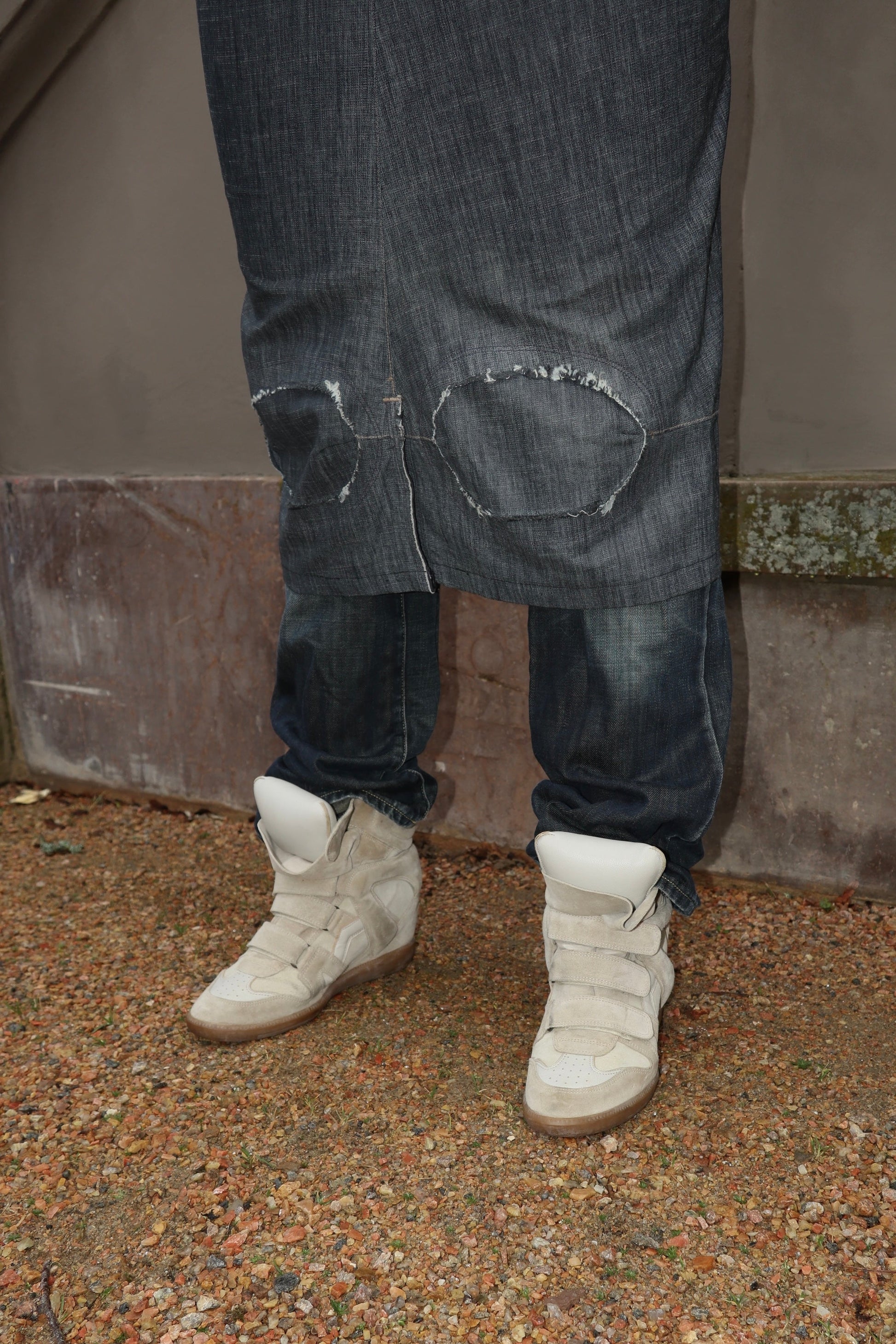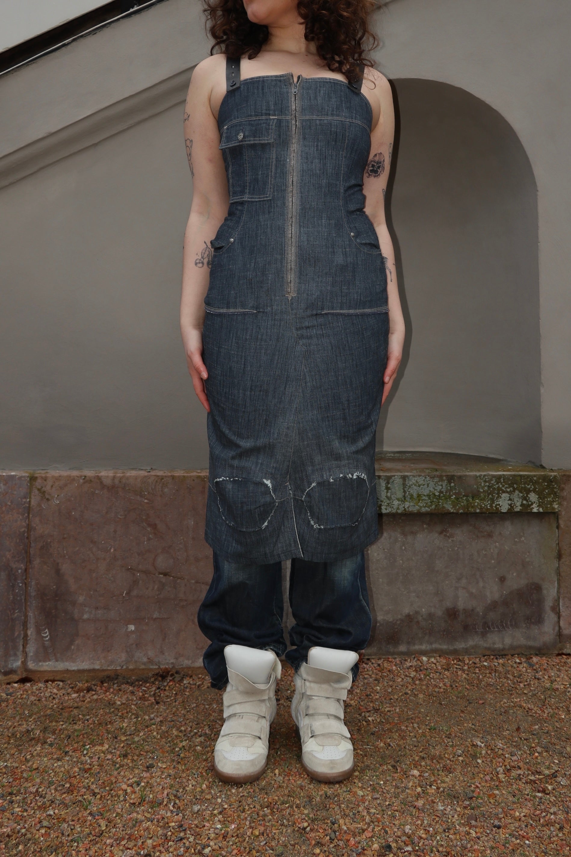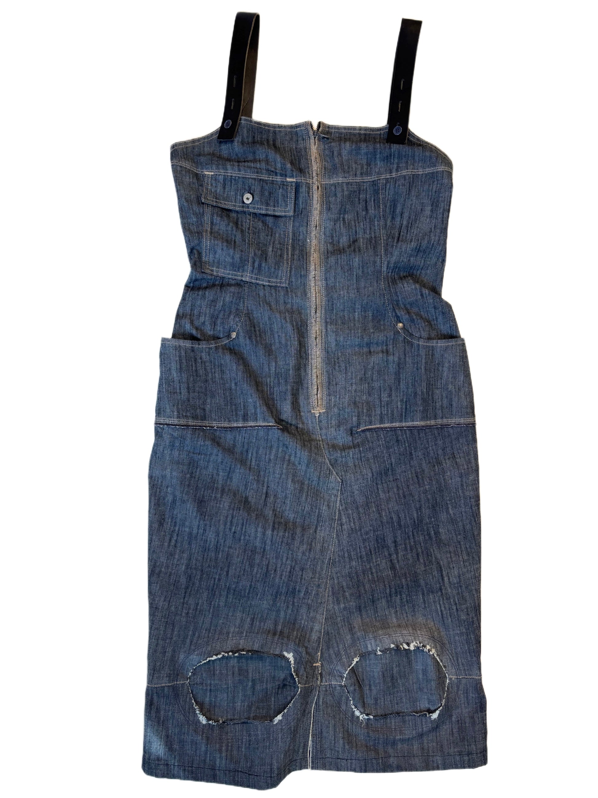 This rare vintage Marithé + François Girbaud denim pinafore dress combines utilitarian edge with playful design. Featuring contrast stitching and patch details, it’s a statement piece perfect for layering over tees or turtlenecks.